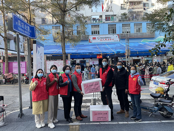 廣東燦城農產(chǎn)品集團有限公司創(chuàng )始人林育英女士看在眼里疼在心里,2月27日下午15:00-16:00,連著(zhù)幾天在林育英女士帶領(lǐng)下,燦城同事前往龍崗區坂田街道、四季花城社區、萬(wàn)科城哥倫布廣場(chǎng)檢測點(diǎn)、萬(wàn)科城南門(mén)檢測點(diǎn)、中海日輝臺(貝爾路地鐵 A出口)檢測點(diǎn)等二十余個(gè)檢測點(diǎn)派送愛(ài)心湯圓,給各站點(diǎn)防疫工作人員送上溫暖。