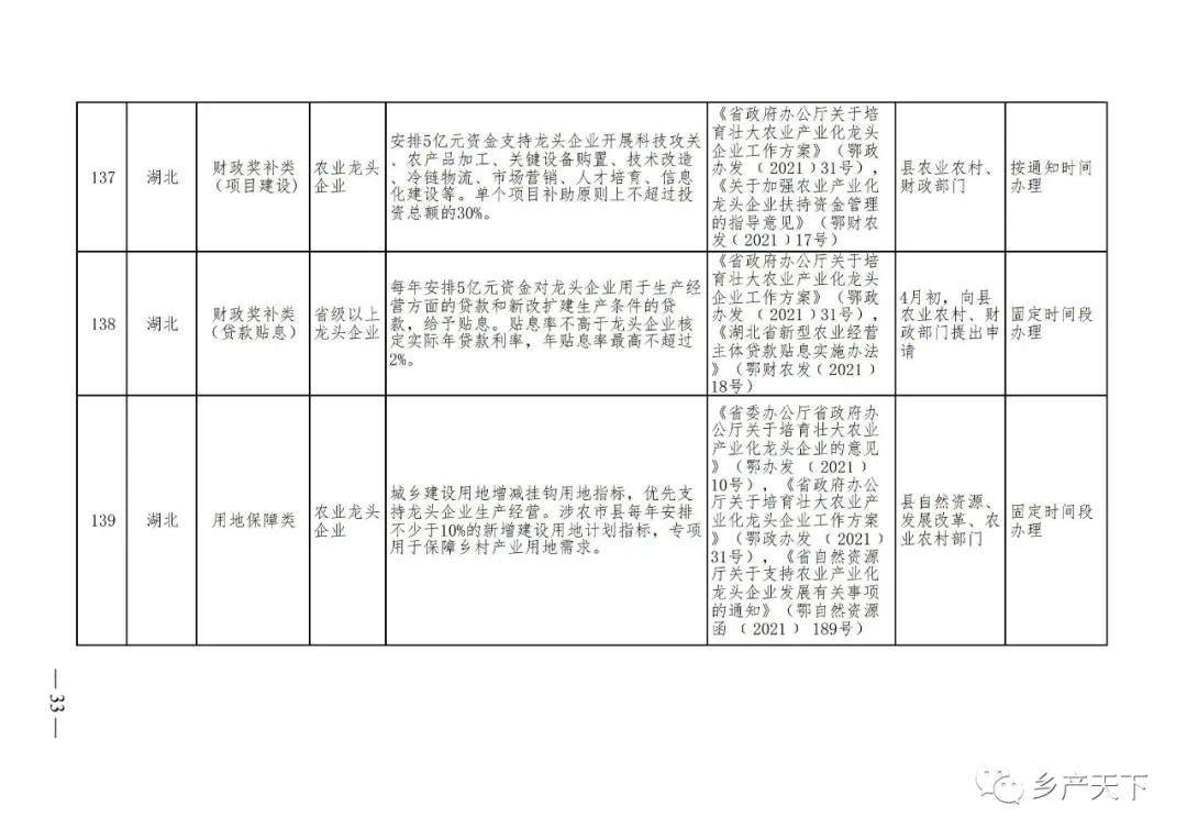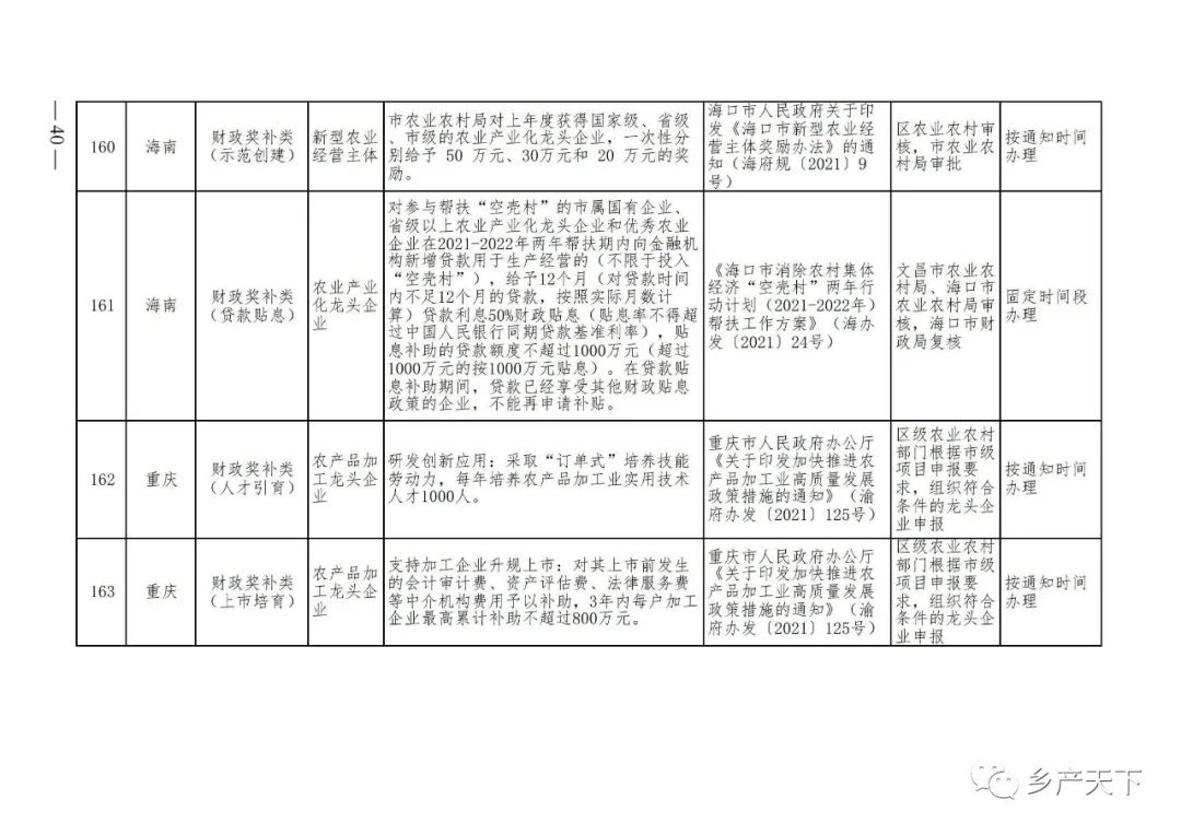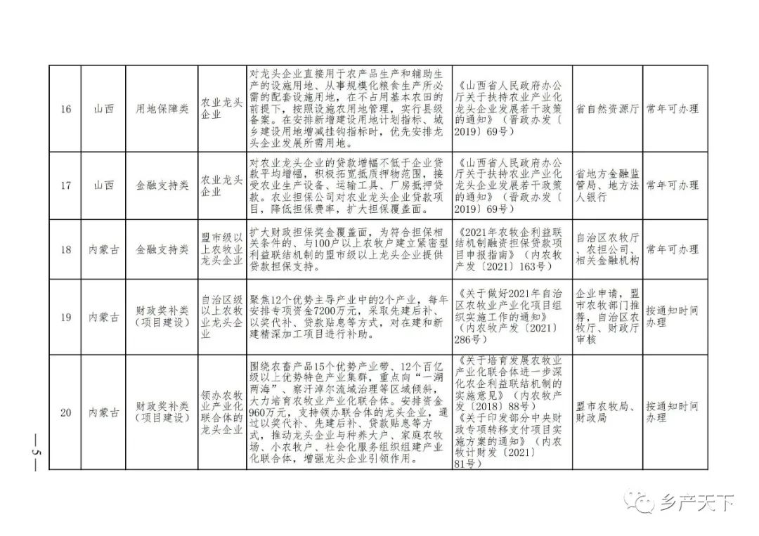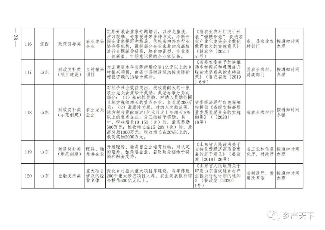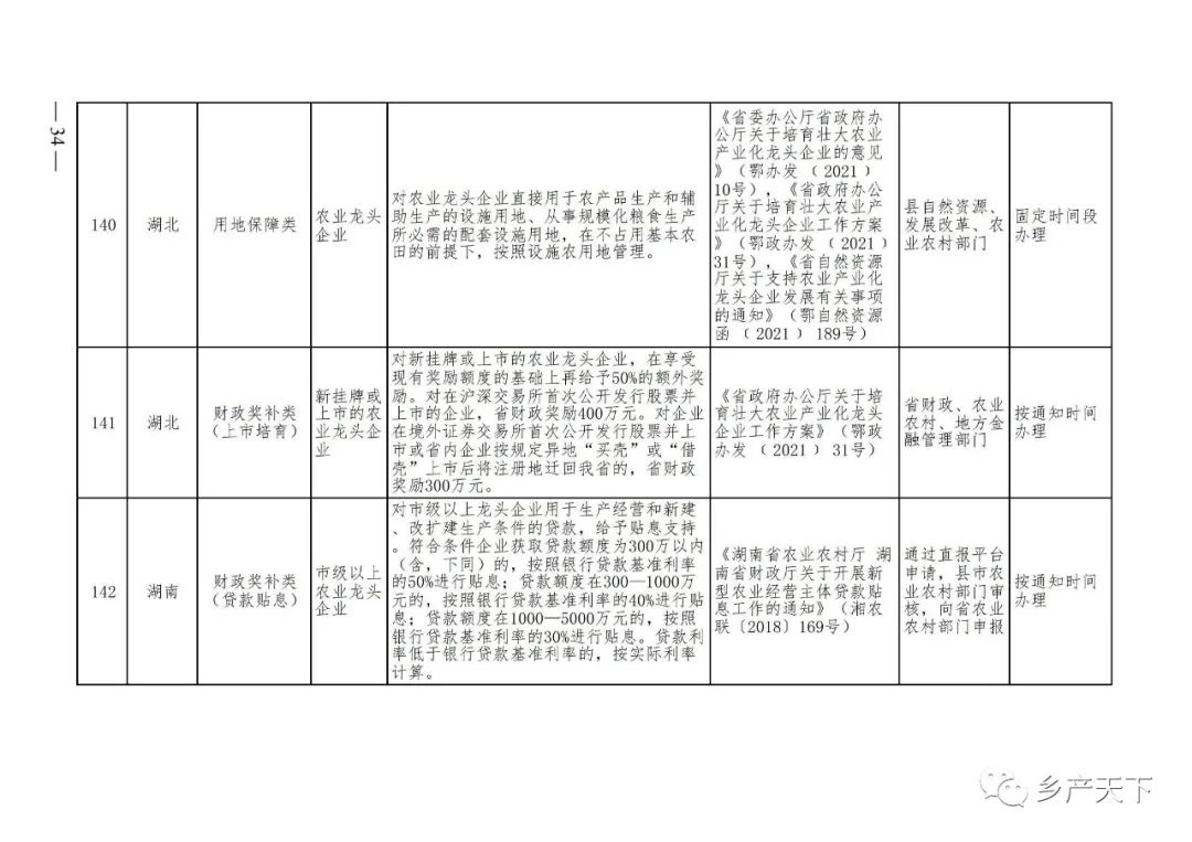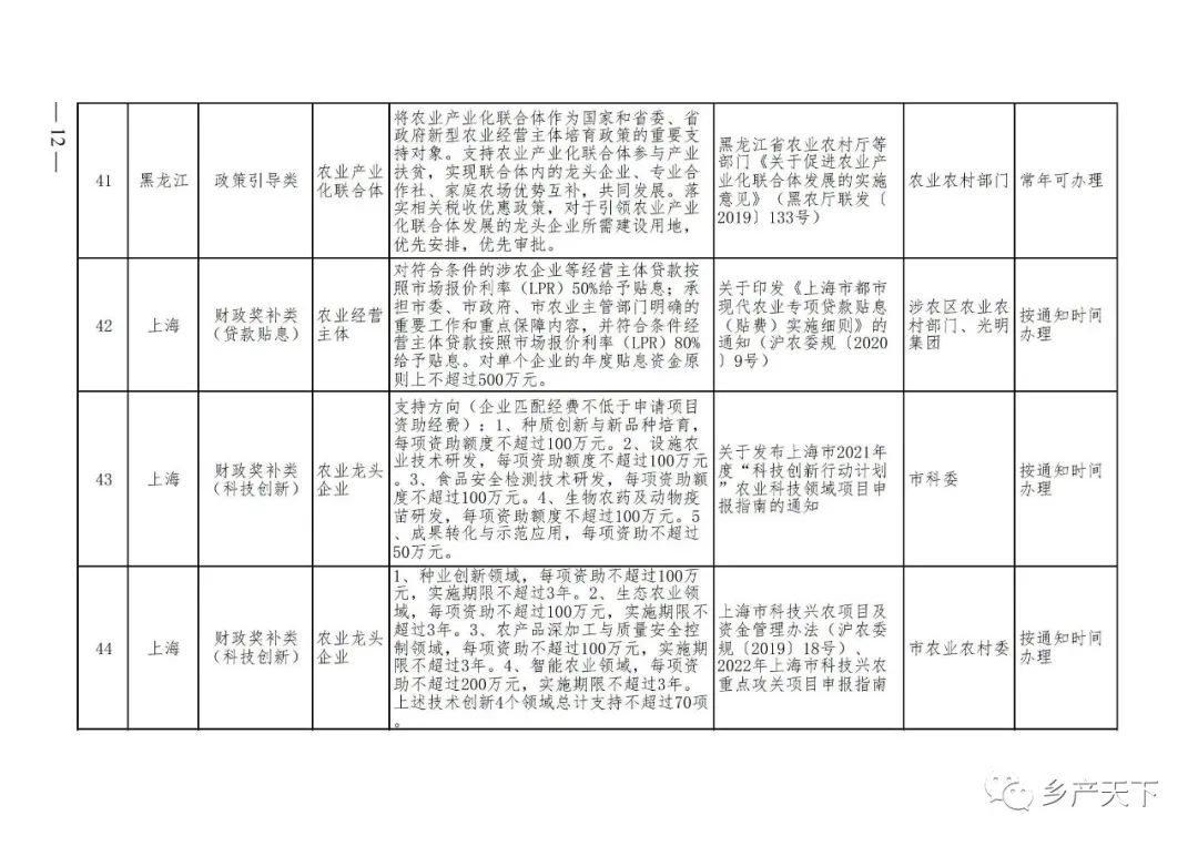 摘要:?為加強對農業(yè)產(chǎn)業(yè)化龍頭企業(yè)的精準服務(wù),農業(yè)農村部鄉村產(chǎn)業(yè)發(fā)展司收集了各?。▍^、市)對龍頭企業(yè)的支持政策,于近期印發(fā)《農業(yè)產(chǎn)業(yè)化龍頭企業(yè)支持政策清單》(簡(jiǎn)稱(chēng)《清單》),供各地互相參考學(xué)習?!肚鍐巍钒凑铡罢哳?lèi)別、支持對象、具體內容、政策依據、辦理部門(mén)、辦理時(shí)間”進(jìn)行梳理,共涉及“財政獎補、金融支持、用地保障、稅費減免、水電優(yōu)惠、政策引導”等六大類(lèi)229條政策?!肚鍐巍吠ㄖ?,各地支持政策發(fā)生變化,要及時(shí)反饋,鄉村產(chǎn)業(yè)發(fā)展司將定期更新發(fā)布。農業(yè)產(chǎn)業(yè)化龍頭企業(yè)支持政策清單...