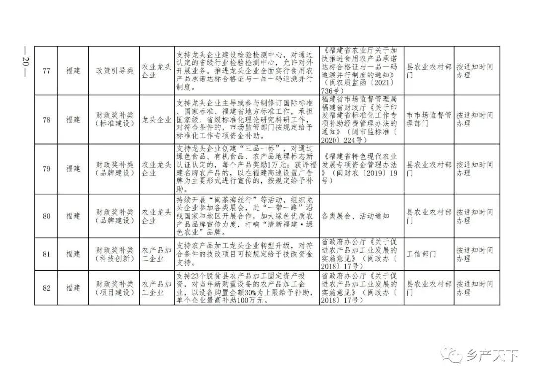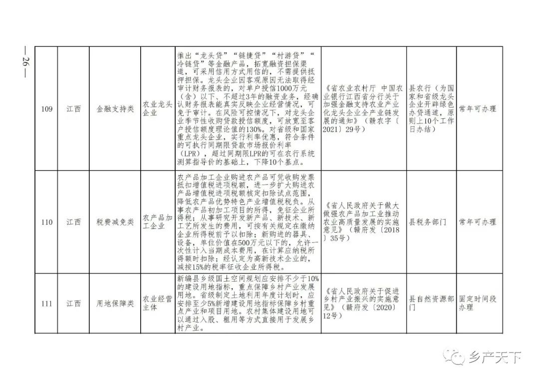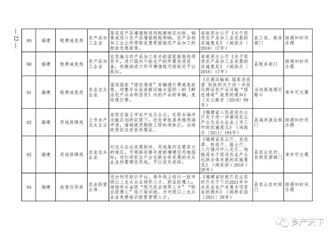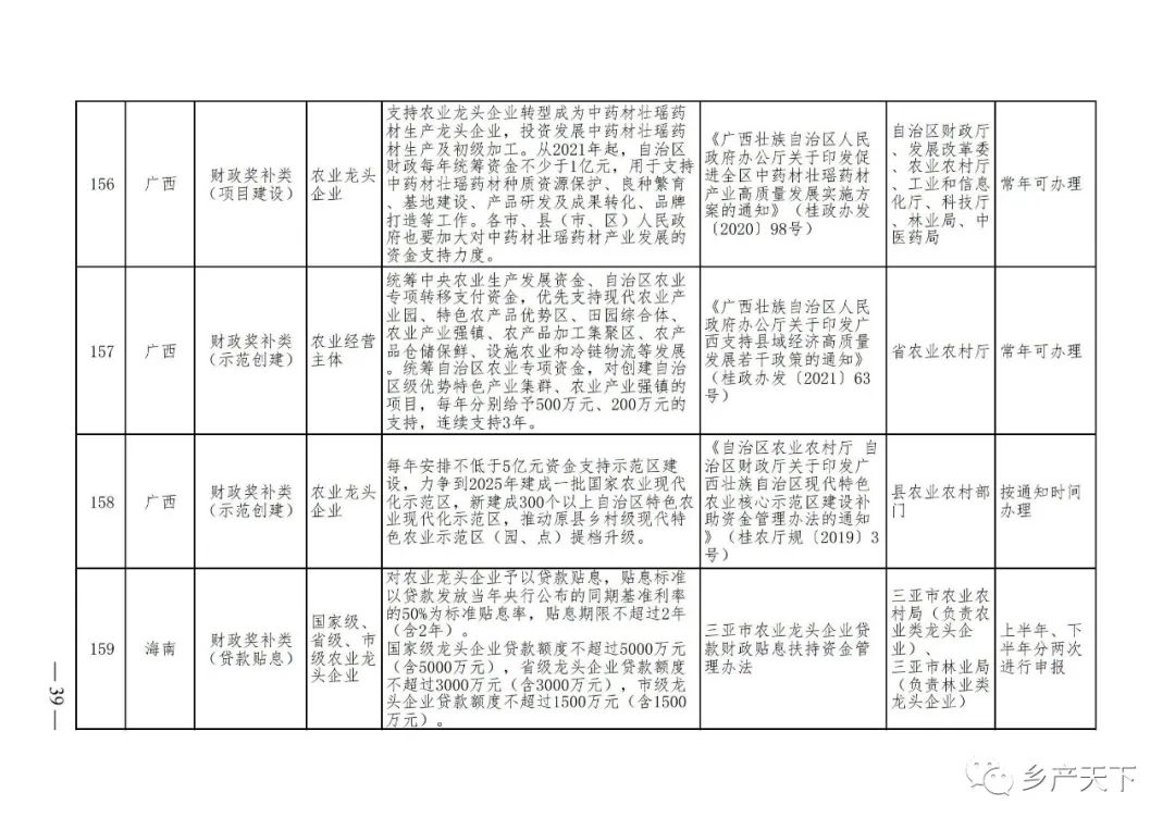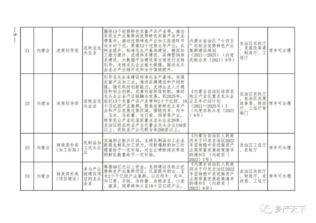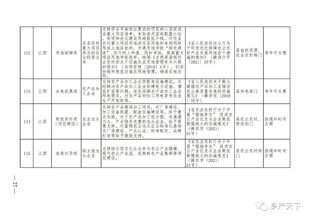 摘要:?為加強對農業(yè)產(chǎn)業(yè)化龍頭企業(yè)的精準服務(wù),農業(yè)農村部鄉村產(chǎn)業(yè)發(fā)展司收集了各?。▍^、市)對龍頭企業(yè)的支持政策,于近期印發(fā)《農業(yè)產(chǎn)業(yè)化龍頭企業(yè)支持政策清單》(簡(jiǎn)稱(chēng)《清單》),供各地互相參考學(xué)習?!肚鍐巍钒凑铡罢哳?lèi)別、支持對象、具體內容、政策依據、辦理部門(mén)、辦理時(shí)間”進(jìn)行梳理,共涉及“財政獎補、金融支持、用地保障、稅費減免、水電優(yōu)惠、政策引導”等六大類(lèi)229條政策?!肚鍐巍吠ㄖ?,各地支持政策發(fā)生變化,要及時(shí)反饋,鄉村產(chǎn)業(yè)發(fā)展司將定期更新發(fā)布。農業(yè)產(chǎn)業(yè)化龍頭企業(yè)支持政策清單...