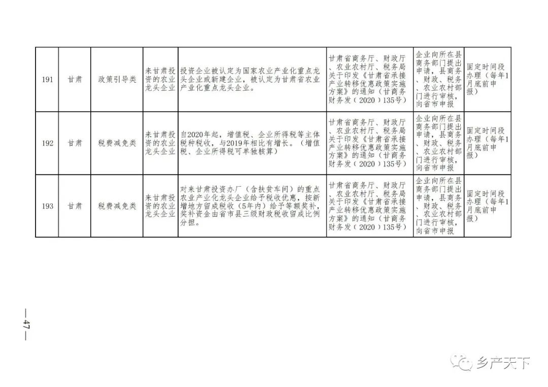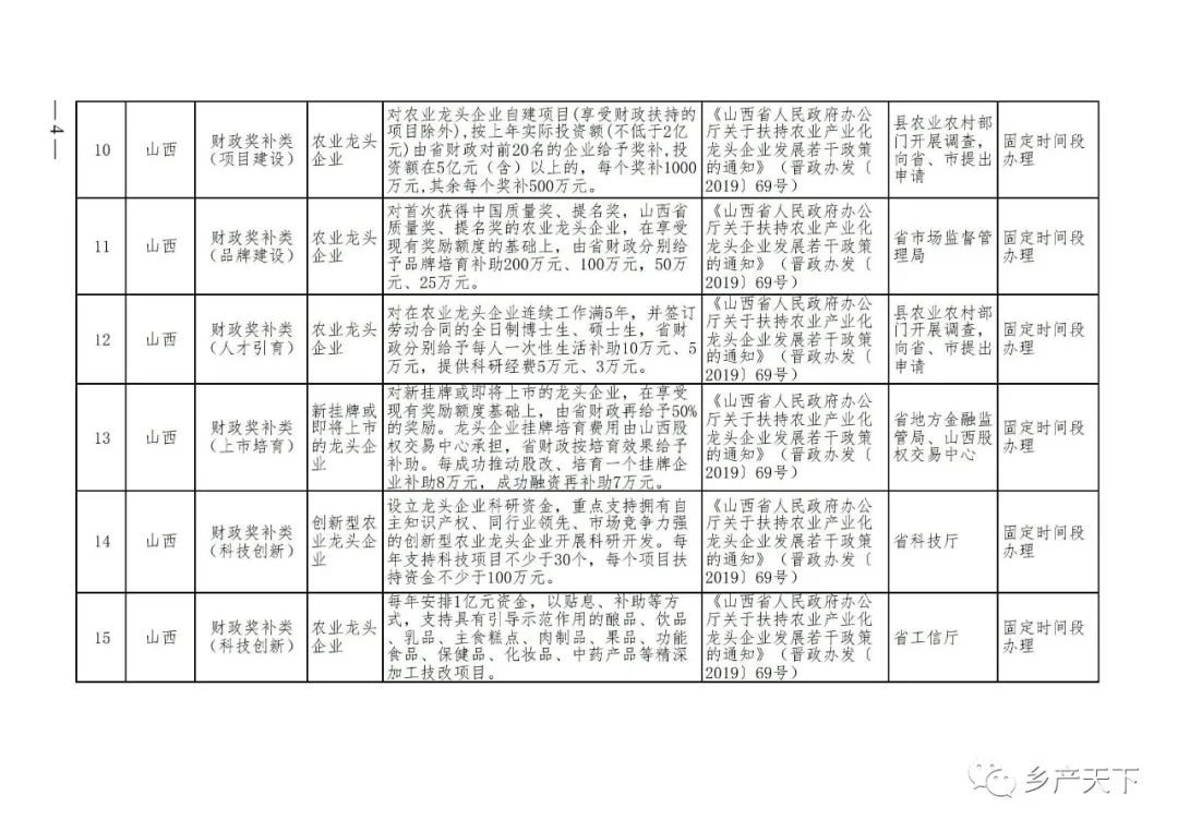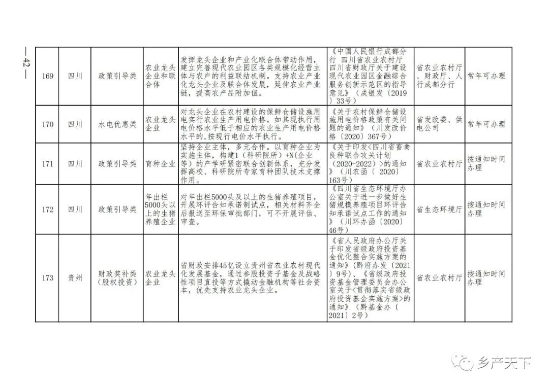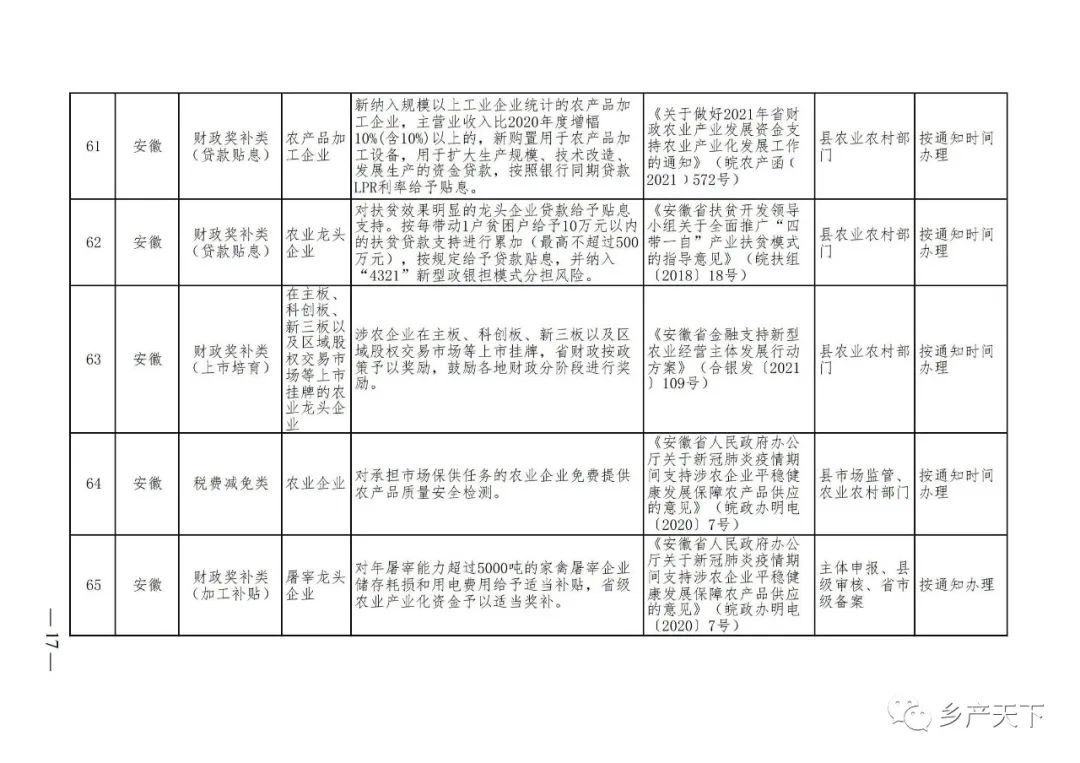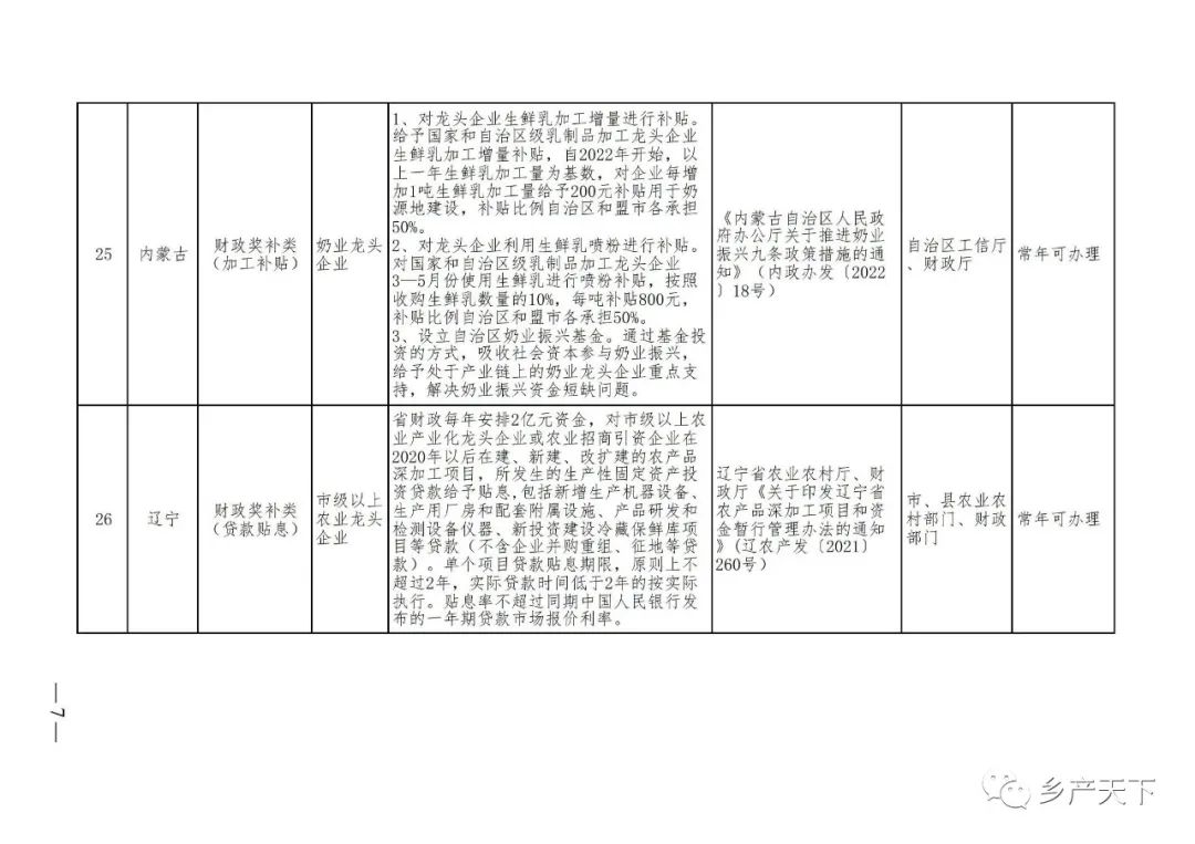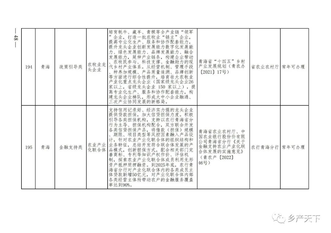 摘要:?為加強對農業(yè)產(chǎn)業(yè)化龍頭企業(yè)的精準服務(wù),農業(yè)農村部鄉村產(chǎn)業(yè)發(fā)展司收集了各?。▍^、市)對龍頭企業(yè)的支持政策,于近期印發(fā)《農業(yè)產(chǎn)業(yè)化龍頭企業(yè)支持政策清單》(簡(jiǎn)稱(chēng)《清單》),供各地互相參考學(xué)習?!肚鍐巍钒凑铡罢哳?lèi)別、支持對象、具體內容、政策依據、辦理部門(mén)、辦理時(shí)間”進(jìn)行梳理,共涉及“財政獎補、金融支持、用地保障、稅費減免、水電優(yōu)惠、政策引導”等六大類(lèi)229條政策?!肚鍐巍吠ㄖ?,各地支持政策發(fā)生變化,要及時(shí)反饋,鄉村產(chǎn)業(yè)發(fā)展司將定期更新發(fā)布。農業(yè)產(chǎn)業(yè)化龍頭企業(yè)支持政策清單...