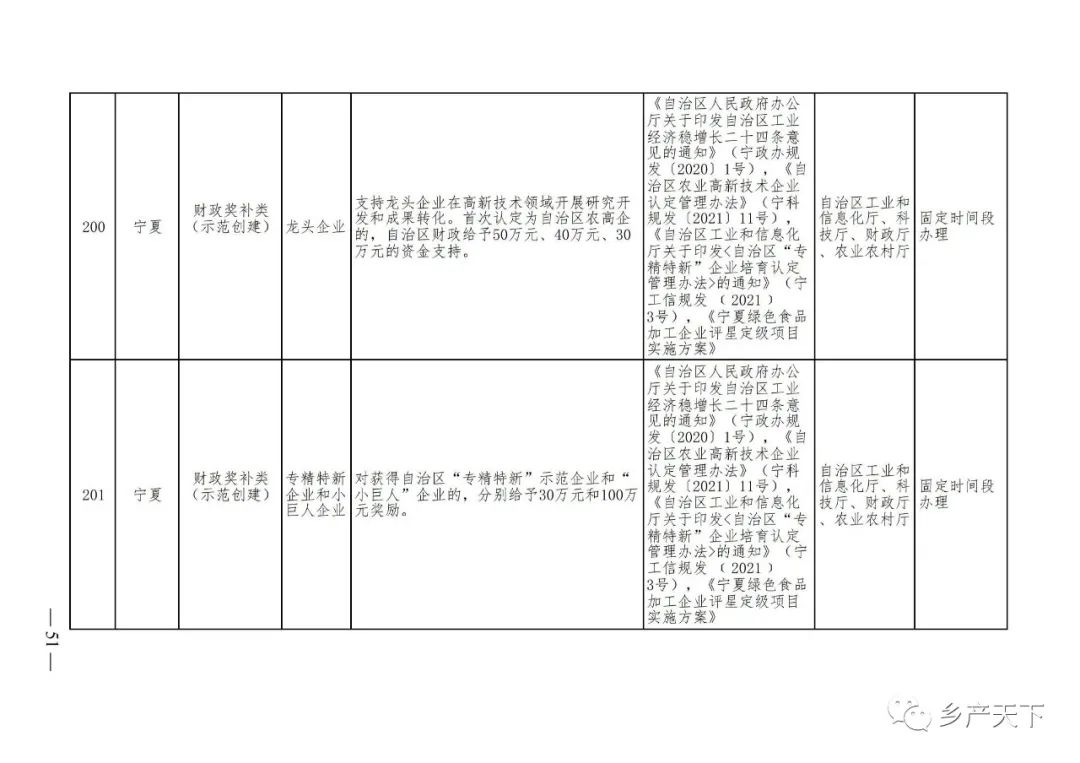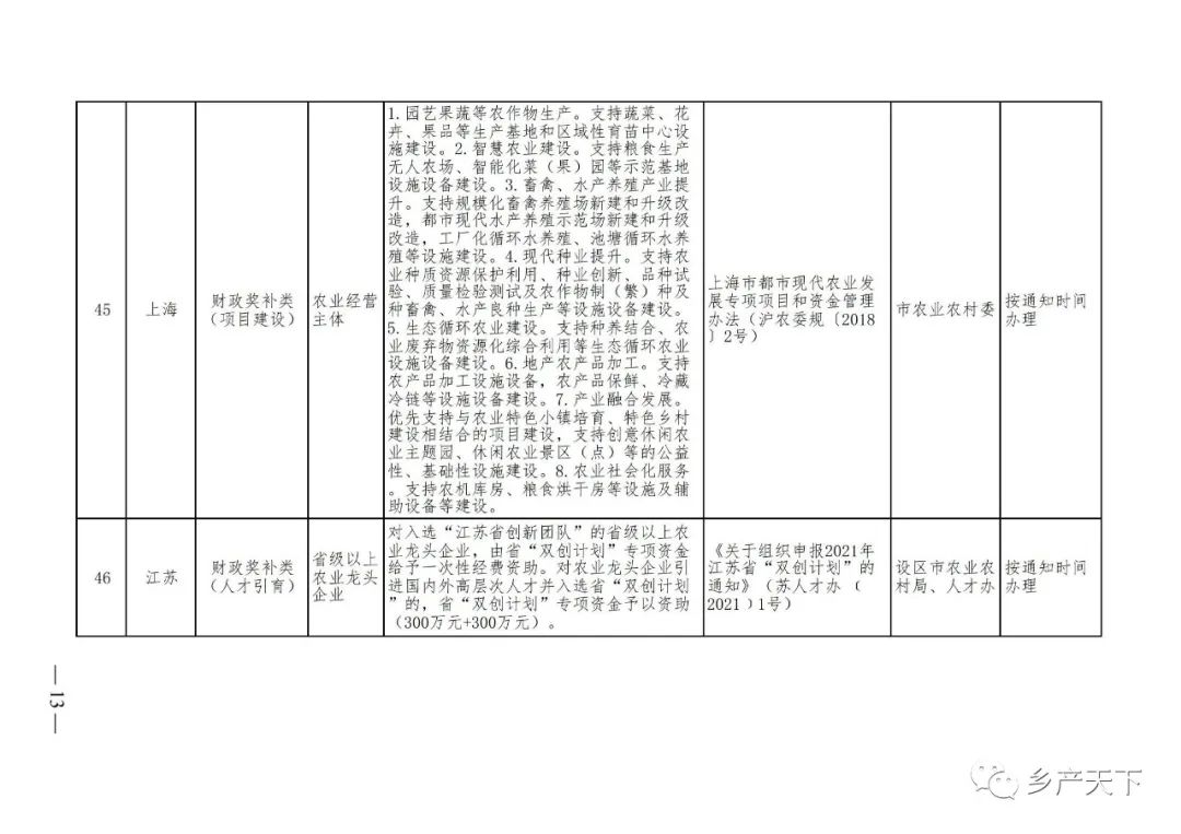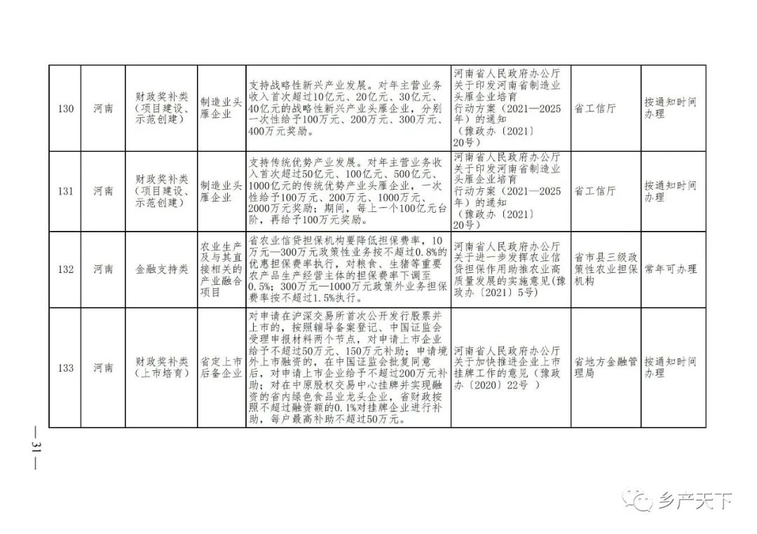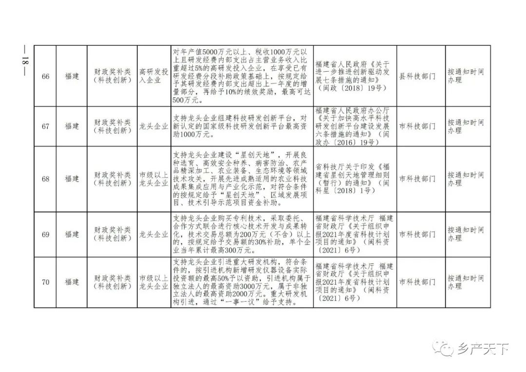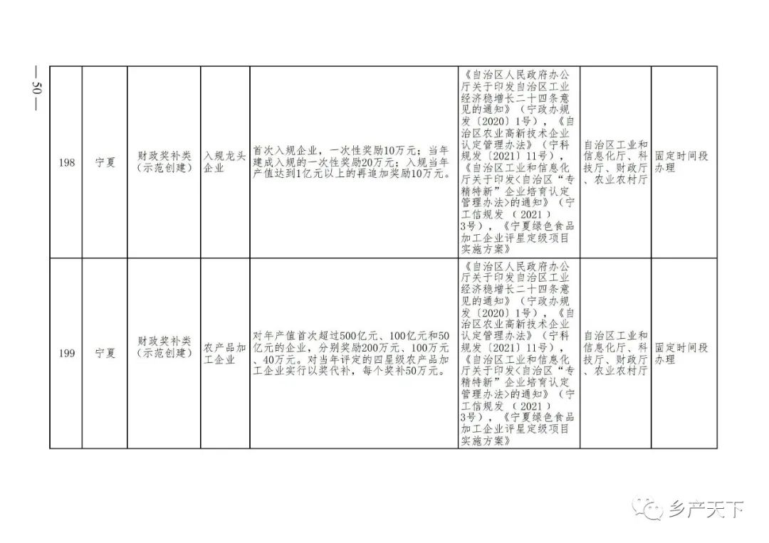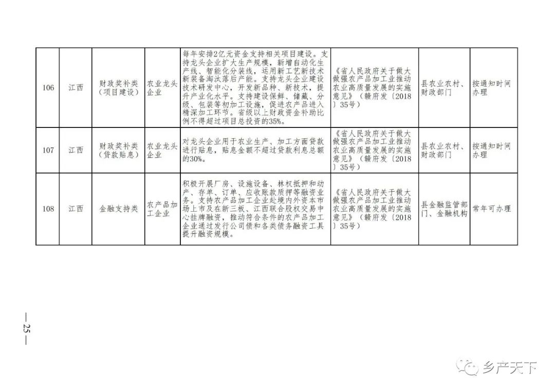 摘要:?為加強對農業(yè)產(chǎn)業(yè)化龍頭企業(yè)的精準服務(wù),農業(yè)農村部鄉村產(chǎn)業(yè)發(fā)展司收集了各?。▍^、市)對龍頭企業(yè)的支持政策,于近期印發(fā)《農業(yè)產(chǎn)業(yè)化龍頭企業(yè)支持政策清單》(簡(jiǎn)稱(chēng)《清單》),供各地互相參考學(xué)習?!肚鍐巍钒凑铡罢哳?lèi)別、支持對象、具體內容、政策依據、辦理部門(mén)、辦理時(shí)間”進(jìn)行梳理,共涉及“財政獎補、金融支持、用地保障、稅費減免、水電優(yōu)惠、政策引導”等六大類(lèi)229條政策?!肚鍐巍吠ㄖ?,各地支持政策發(fā)生變化,要及時(shí)反饋,鄉村產(chǎn)業(yè)發(fā)展司將定期更新發(fā)布。農業(yè)產(chǎn)業(yè)化龍頭企業(yè)支持政策清單...