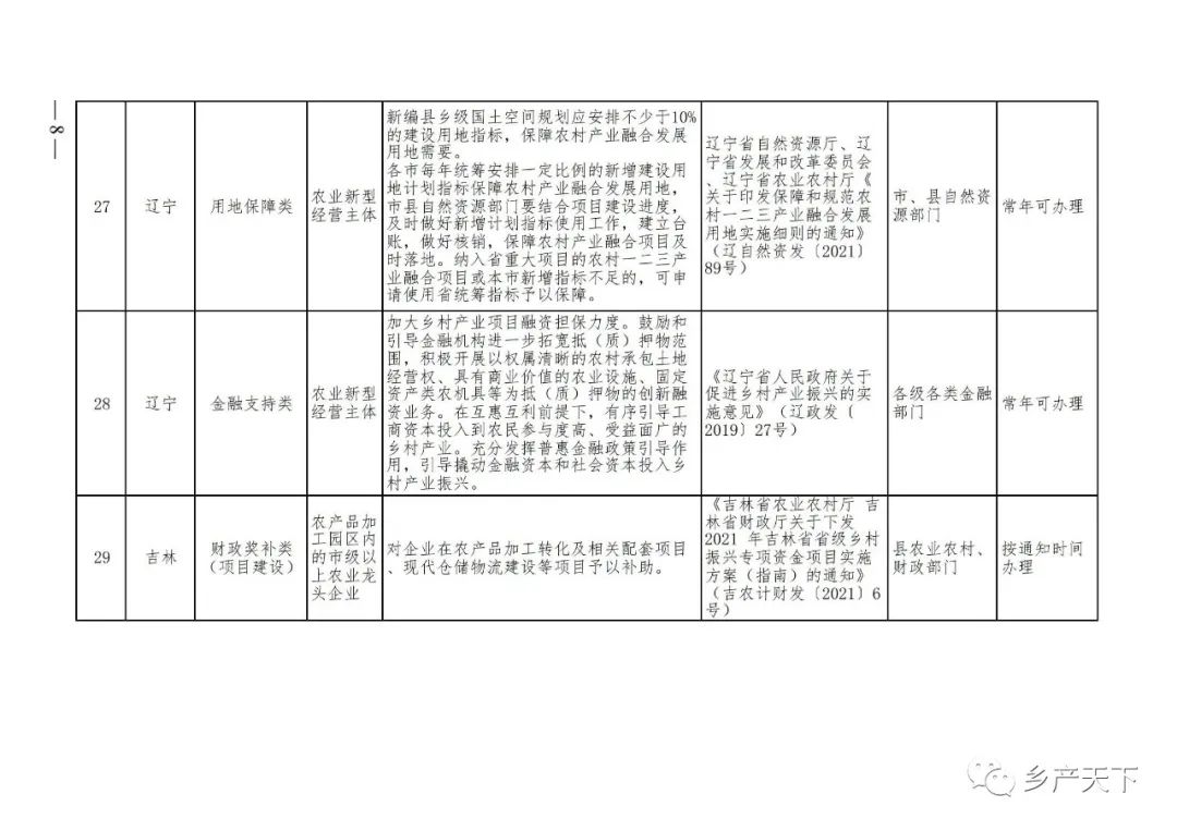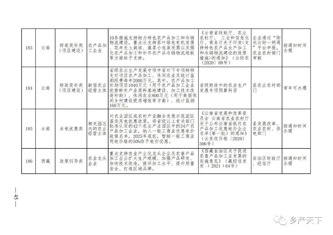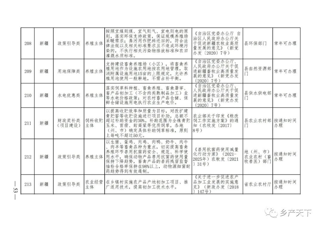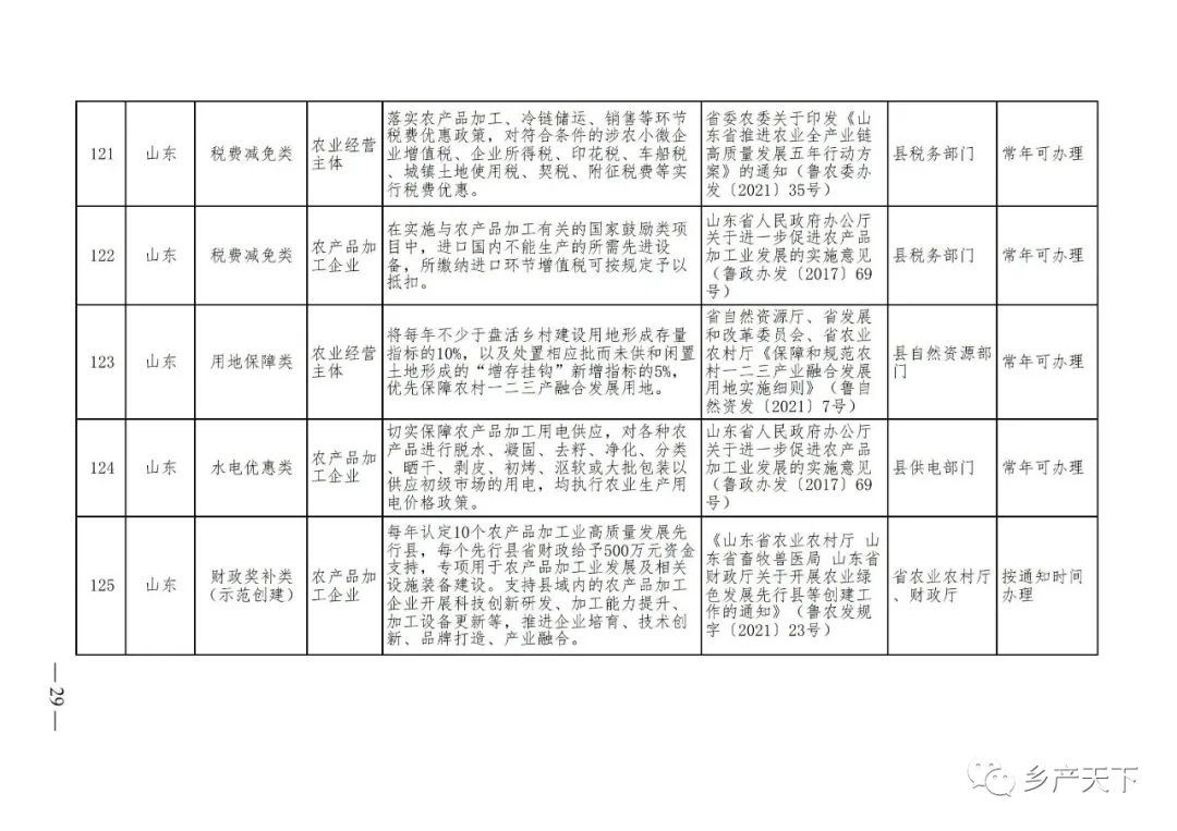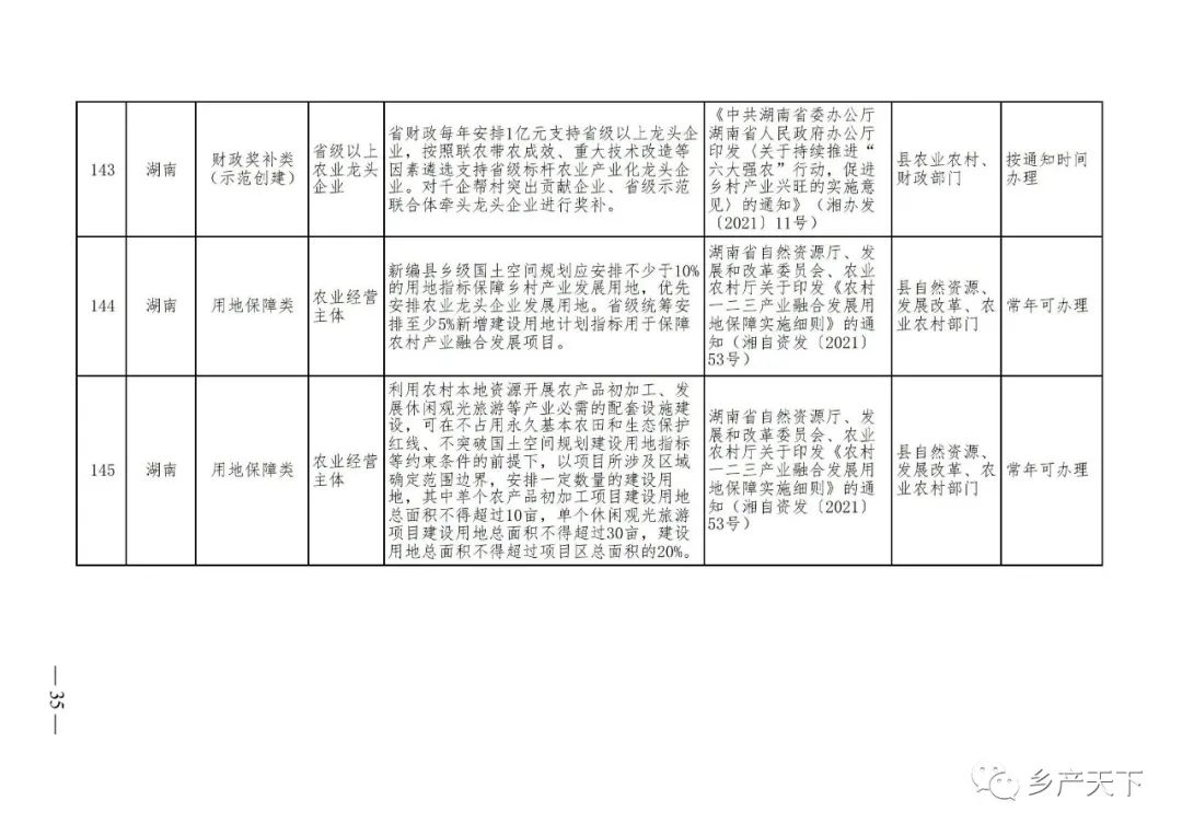 《清單》按照“政策類(lèi)別、支持對象、具體內容、政策依據、辦理部門(mén)、辦理時(shí)間”進(jìn)行梳理,共涉及“財政獎補、金融支持、用地保障、稅費減免、水電優(yōu)惠、政策引導”等六大類(lèi)229條政策?!肚鍐巍吠ㄖ?,各地支持政策發(fā)生變化,要及時(shí)反饋,鄉村產(chǎn)業(yè)發(fā)展司將定期更新發(fā)布。