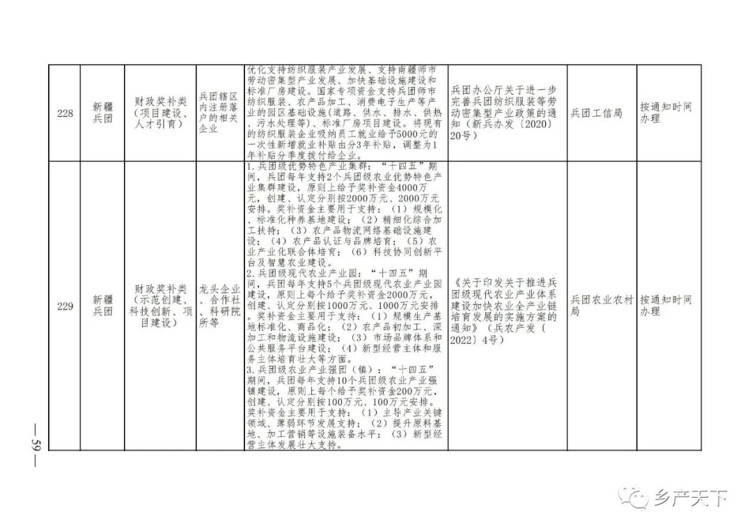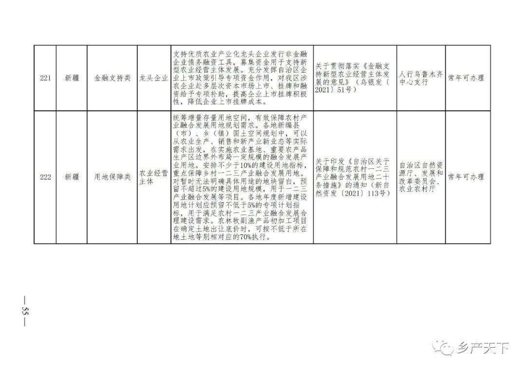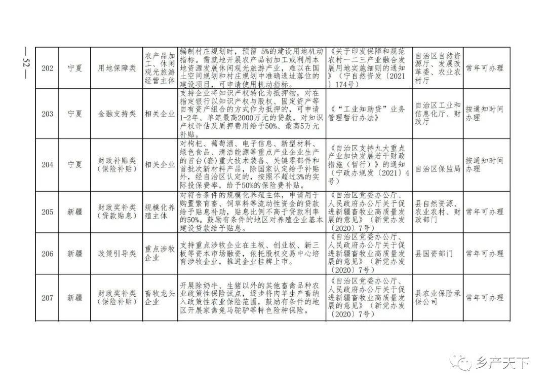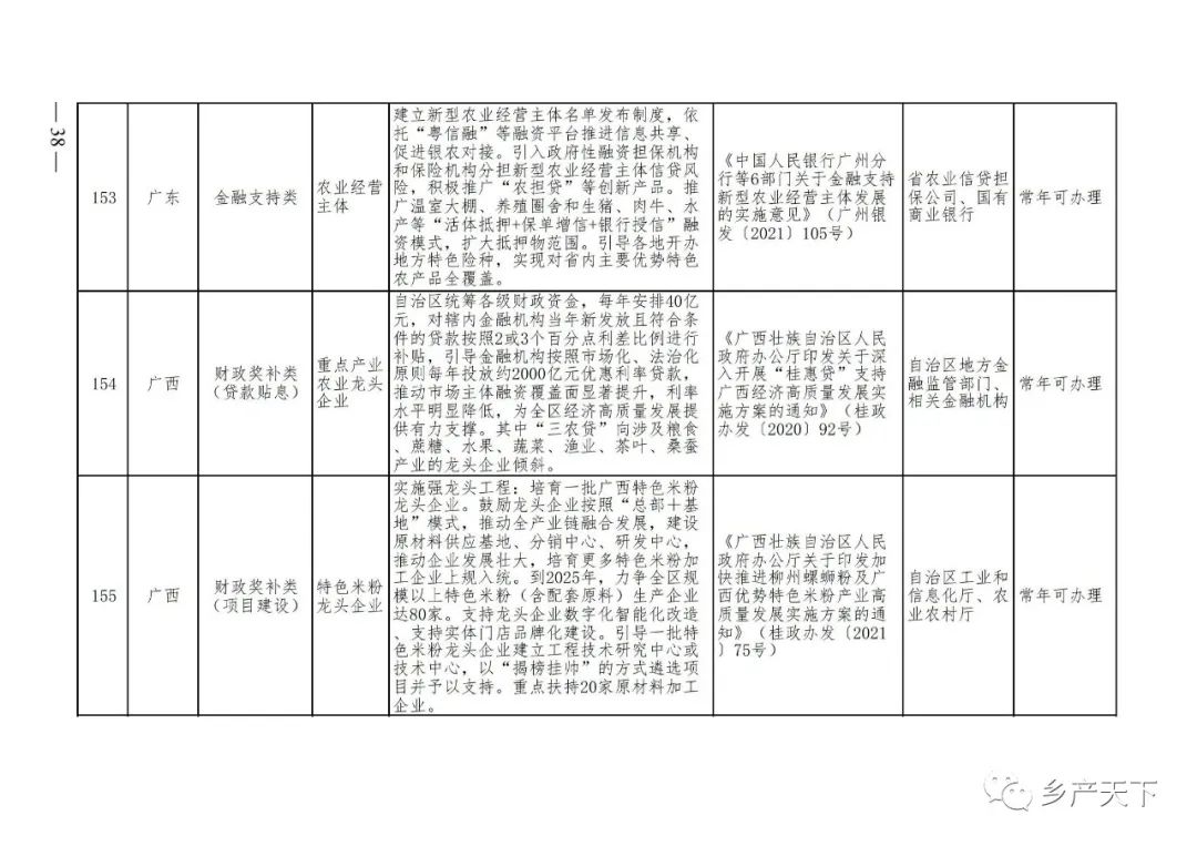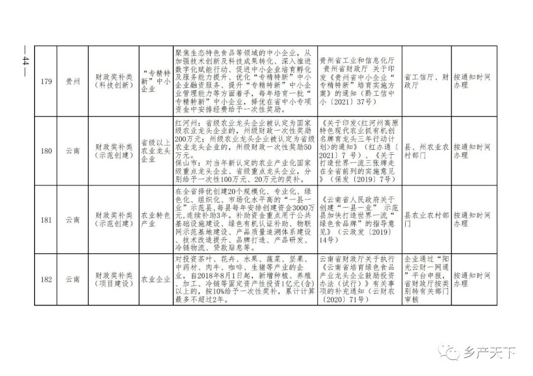 《清單》按照“政策類(lèi)別、支持對象、具體內容、政策依據、辦理部門(mén)、辦理時(shí)間”進(jìn)行梳理,共涉及“財政獎補、金融支持、用地保障、稅費減免、水電優(yōu)惠、政策引導”等六大類(lèi)229條政策?!肚鍐巍吠ㄖ?,各地支持政策發(fā)生變化,要及時(shí)反饋,鄉村產(chǎn)業(yè)發(fā)展司將定期更新發(fā)布。